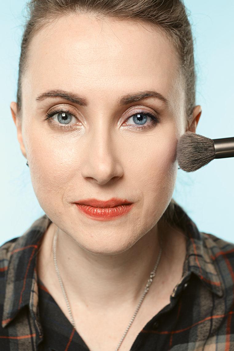 Покраснения на лице скроет праймер с зеленым оттенком. После нанеси немного тона. Подчеркни яблочки щек румянами персикового цвета и хайлайтером выдели скулы и спинку носа.