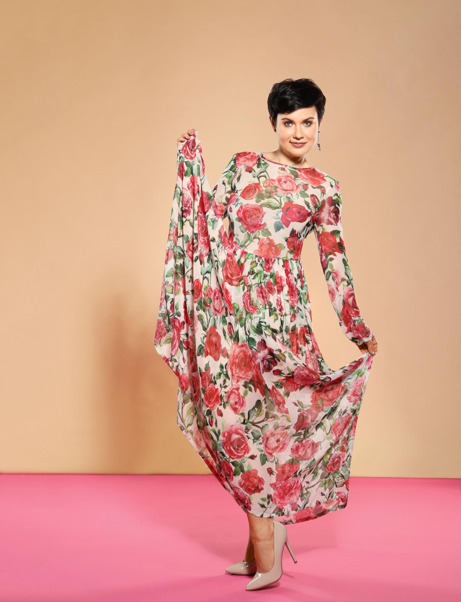 Макси-платье с цветочным принтом и лаковые бежевые лодочки – беспроигрышное сочетание. Дополняем утонченный образ любимыми украшениями: асимметричными серьгами или крупным кольцом.