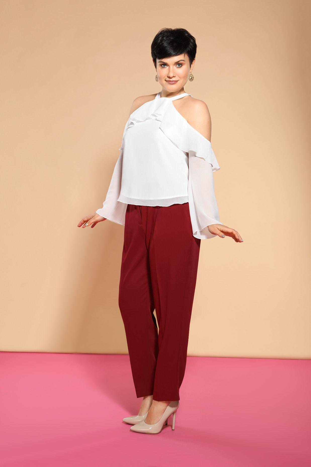 Сочетание белого и красного – излюбленный прием дизайнеров. Огненные брюки прямого кроя сделают ноги бесконечными, а нежный топ с открытыми плечами визуально удлинит шею.