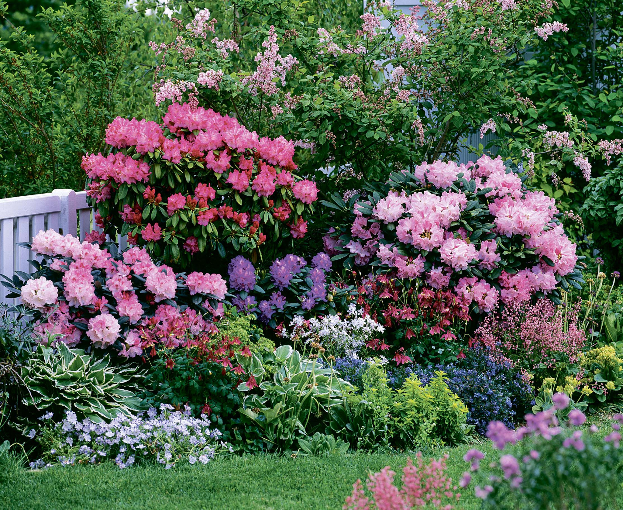 Это сложная клумба, в которой высажено несколько рядов растений разной высоты. Расстояние соблюдать при такой посадке нелегко: чем ближе, тем пышнее будет посадка. На заднем фоне помещают высокорослые сорта лилейника или гортензии древовидной. Расстояние между ними и следующим рядом – 1,5–2 м. Средний ярус можно заполнить пионами, гортензией садовой. Отступи 0,4 м до следующего яруса: здесь на первом плане хорошо смотрятся флоксы, хоста, гейхера (между ними тоже оставь расстояние до 1 м – растения будут разрастаться). Такую посадку лучше делать в виде трапеции, где основание – это первый ряд. Пустоты обычно заполняют однолетниками на свой вкус.