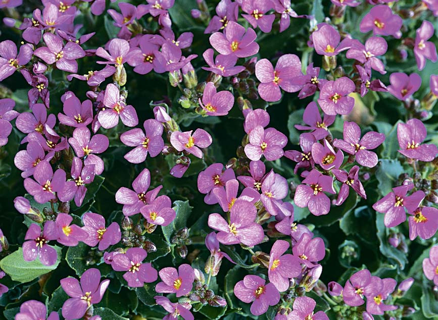 2. Арабис. Цветение начинается в апреле и продолжается до первых заморозков. Растение стелется по земле, стебли достигают 20–30 см. Быстро образует плотные кустики с полосатой листвой и мелкими цветами. Умеренная стрижка помогает продлить период цветения. Арабис высаживают на альпийских горках, возле садовых дорожек рядом с декоративными кустарниками.