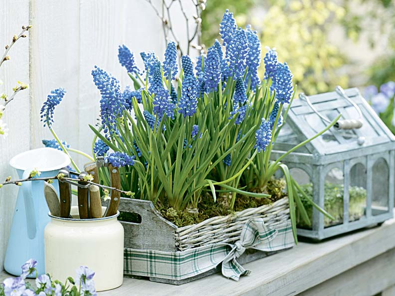 2. Мускари. «Мышиный гиацинт» цветет с апреля по май. Растение невысокое, 8–20 см, соцветия напоминают колокольчики. Хорошо растет под кронами декоративных кустарников, например, сирени. С другими первоцветами не конфликтует. Разросшиеся цветы рассаживают в июне. В активный период цветения им нужна влага.