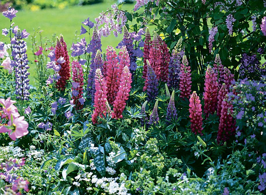 6. Люпин. Цветет два раза за дачный сезон: в начале лета и во второй половине. Высота растений – до одного метра. Любят солнечные участки, недостаток полива компенсируют мощным корневищем, которое достает влагу из глубины. Идеальный сосед для аквилегии, нивяника и мака.