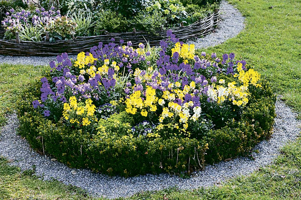 В центре можно посадить один цветок (бузульник, например), по кругу еще 5 многолетников (астры, хризантемы, флоксы, ирисы, пионы). Расстояние от центра не менее 0,5 м, между круговыми – 0,2–0,3 м. Пустоты можно засеять небольшими однолетними цветами: бархатцами или петуньями.
