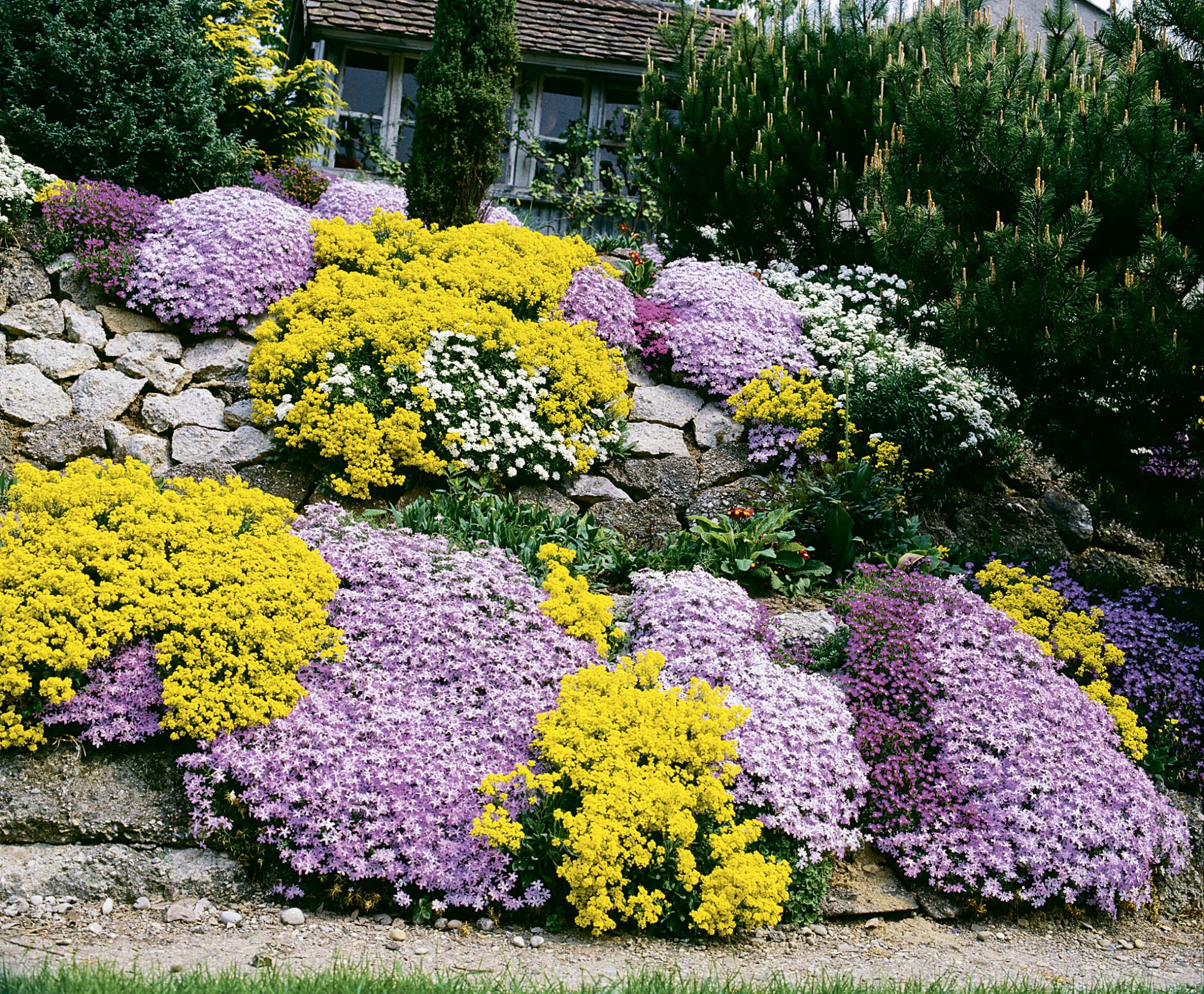 Мы предлагаем посадить на заднем плане декоративные и хвойные кустарники – барбарис, тую, можжевельник скальный, шток-розу. Расстояние не менее метра, чтобы корни не мешали друг другу. В середине флоксы, можжевельник горизонтальный, на первом ярусе другие стелющиеся цветы (вербейник монетчатый) или небольшие весенние первоцветы. Чем меньше растение, тем ближе сажают соседа.