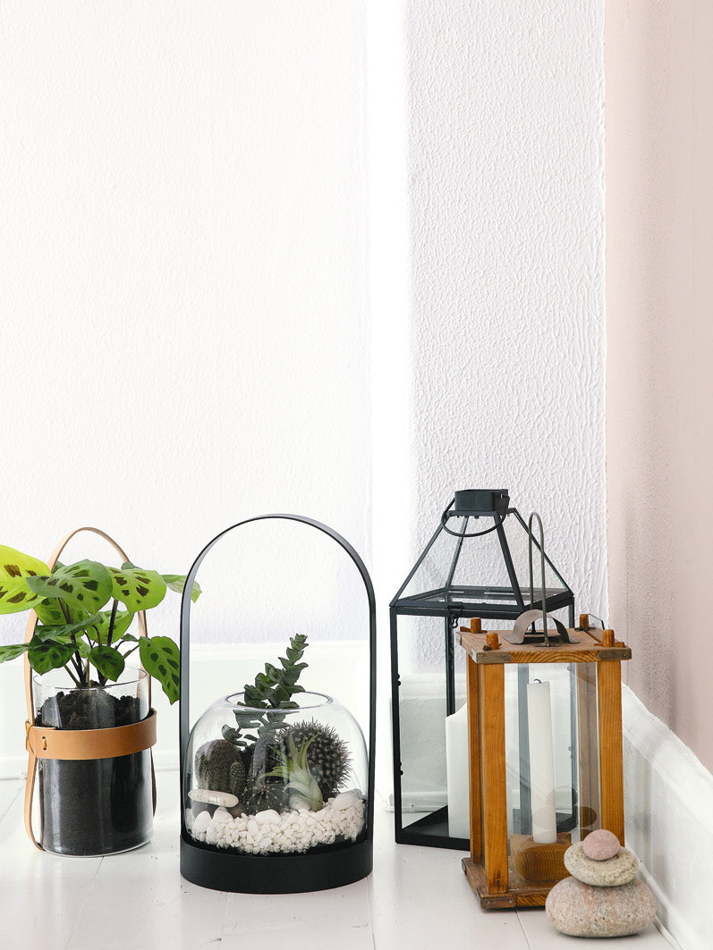 Кактусы с суккулентами высаживают в условия, близкие к пустынным. Эти композиции – находка для новичков, их несложно собрать, растения в них живучи, а выглядят такие инсталляции эффектно. В отличие от «тропиков» и «гор» в этом случае лучше подобрать открытую тару – с широким горлышком или без одной стенки. Иначе влажность слишком увеличится, почва будет долго просыхать, а суккуленты этого не любят. Грунт понадобится рыхлый, добавление песка тоже будет кстати. Поставить такой флорариум можно на подоконник или в другое солнечное место.