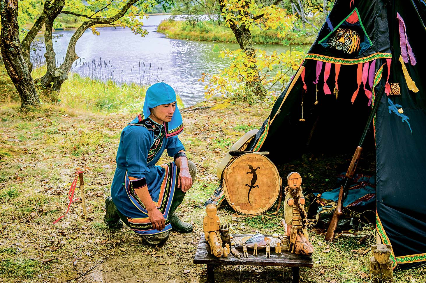 Костюм из кожи и меха животных, украшенный орнаментом. Его шаман должен изготовить вручную сам, как и музыкальный инструмент. Наряд помогает связываться с сущностями из других миров, но одновременно выполняет и защитную функцию, охраняя душу мага от непрошенных гостей. Также к одежде можно отнести маски.