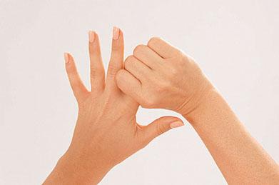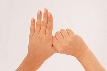 Левую руку согни в локте перед грудью и соедини большой и указательный пальцы в кольцо на 5 минут. Затем проделай то же самое с другими пальцами.