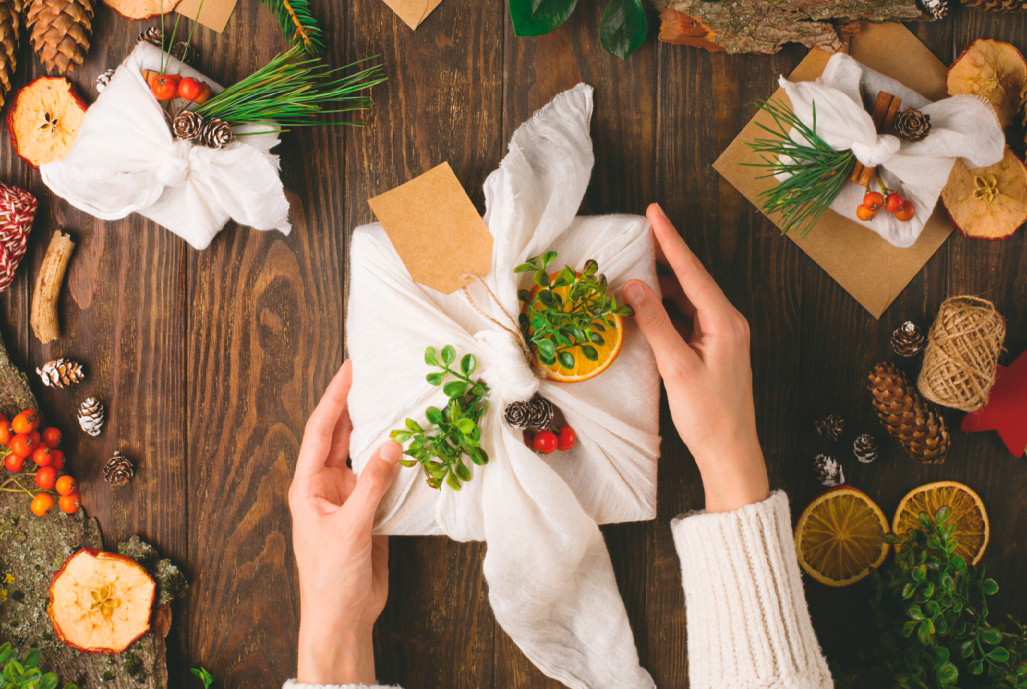 Купила упаковочную бумагу с традиционным узором «в елочку»? Можно просто завернуть в нее подарок и успокоиться. Но лучше приобрести хвойные ветки, которые продаются на елочных базарах. Оторви от ветки пару молодых росточков. Закрепи их на подарке, перевязав тесьмой в виде букетика, или расположи фантазийно, приклеив скотчем. Такой декор дополнит общую стилистику упаковки и будет выглядеть очень атмосферно.