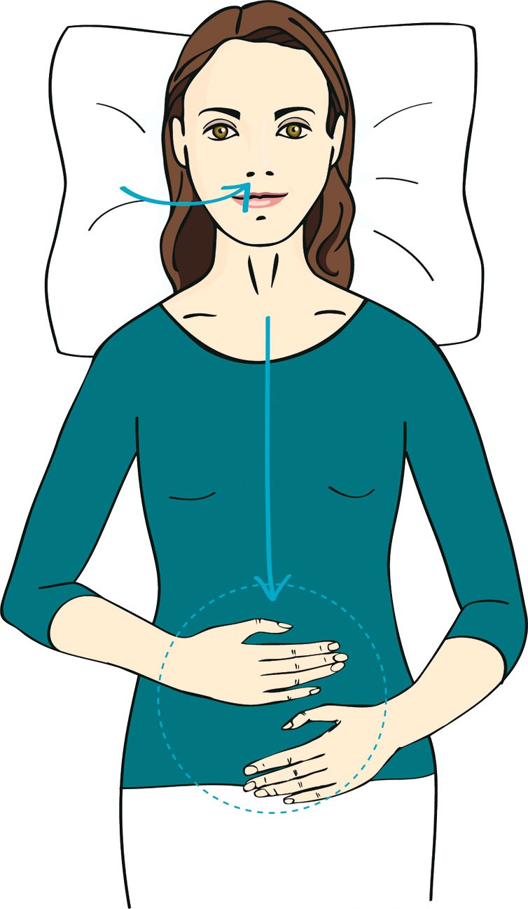 В этом упражнении вся нагрузка ложится на диафрагму. То есть во время медленного вдоха-выдоха приподнимается и опускается только живот, а грудь остается неподвижной. Дыши так 5 минут.