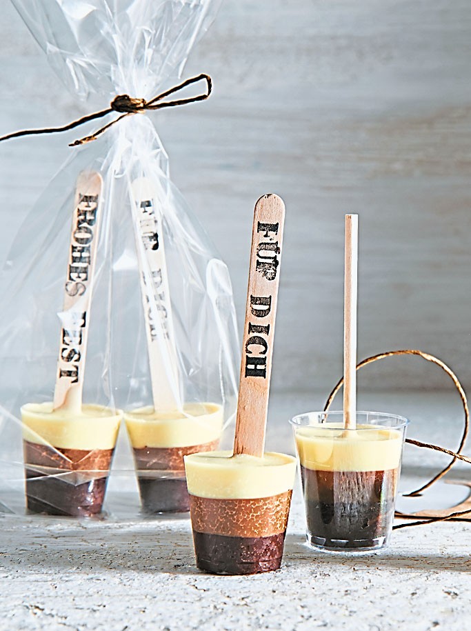 Приготовление: Все виды шоколада наломать и растопить в разных емкостях. Небольшие пластиковые стаканчики выстелить пищевой пленкой. На дно каждого налить горький шоколад и дать ему немного застыть. Воткнуть деревянные палочки. Затем по стаканчикам разлить молочный шоколад и снова дать застыть. Так же поступить и с белым. Десерту дать полностью застыть в холодном месте. Затем быстро опустить каждый стаканчик в горячую воду и вынуть десерт. Пленку осторожно удалить.