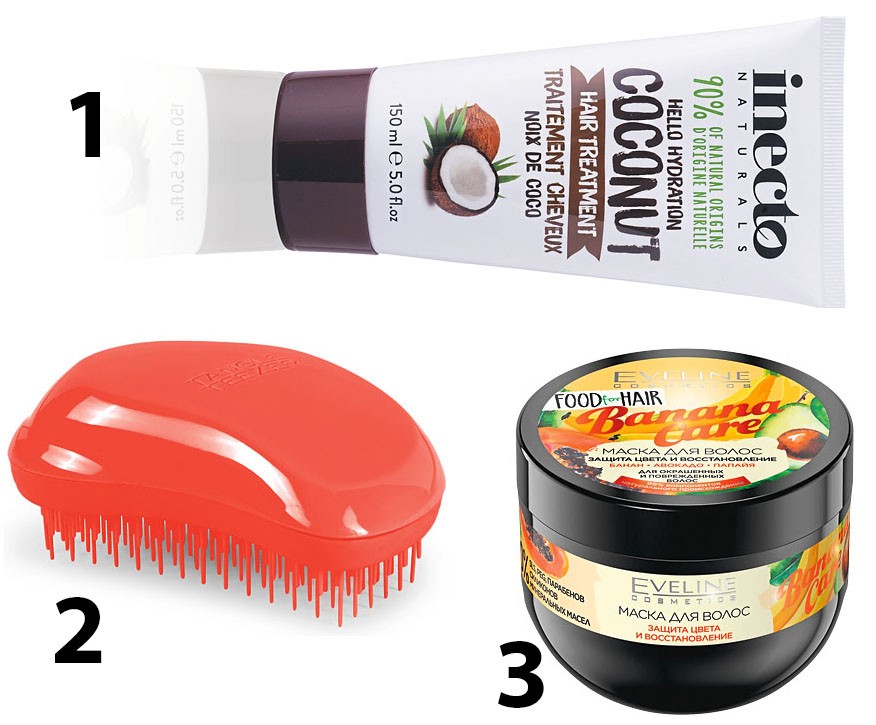 - Нанеси по длине волос разглаживающий спрей для укладки и расчеши их. Собери в хвост. Раздели его на две части.