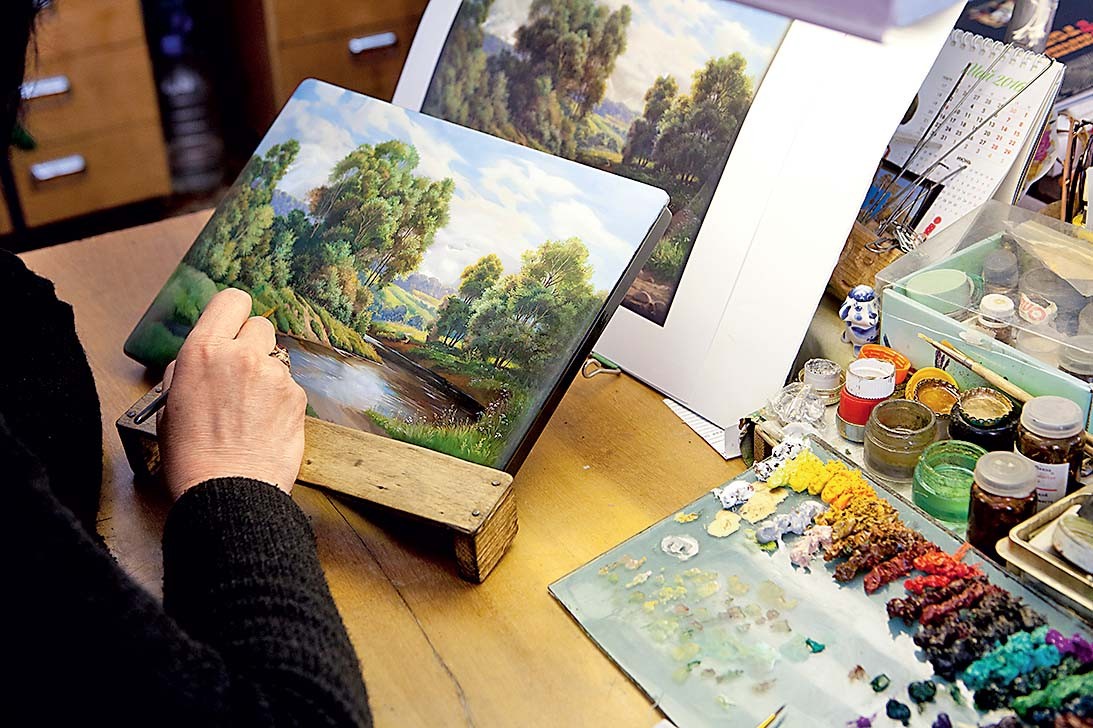 Затем пока еще неказистую коробочку ждет шлифовка, грунтовка (алюминиевым порошком, иногда на этой стадии наносится сусальное золото и перламутр), лакировка (применяют до 24 слоев) и роспись. Весь процесс производства может занимать полгода. Такая это кропотливая и тонкая работа, за которой стоит труд десятков людей.
