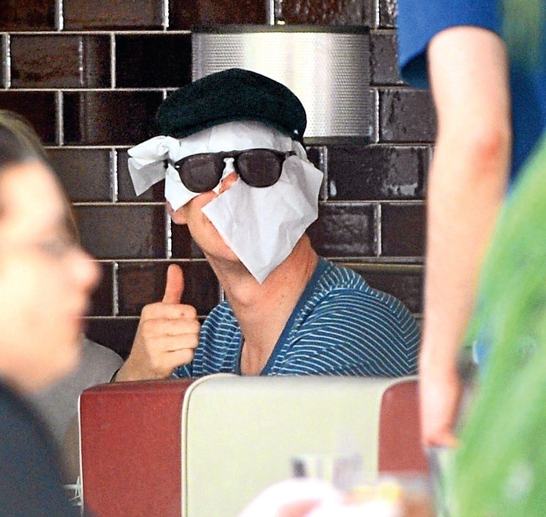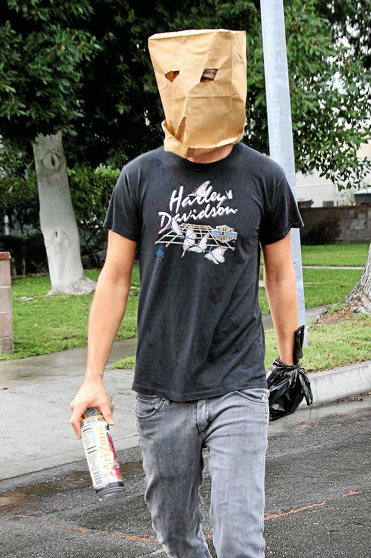 Удобны ли бумажные пакеты для упаковки ланча? Скорее, нет. Перед нами пример, когда вместо того, чтобы положить туда бутерброд, актеру оказалось удобнее надеть его на голову. Вездесущие фотографы были явно раздосадованы самодельным камуфляжем.