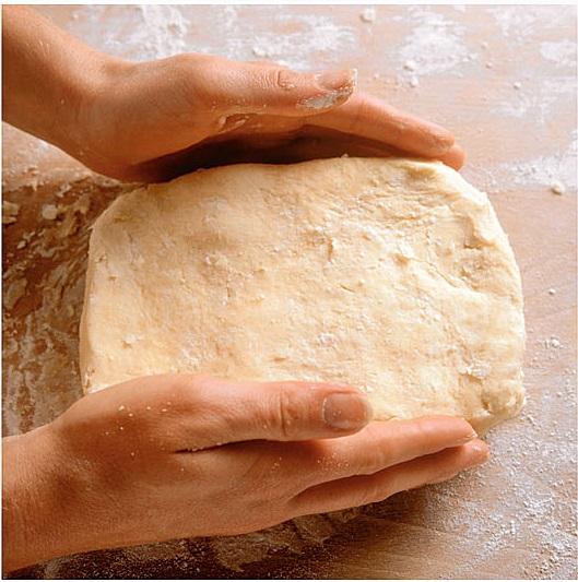 4. Пласт теста сложить вчетверо, завернуть в пленку и убрать в холодильник на 30 мин. Так повторить 3 раза. Получившееся тесто охладить и использовать по назначению.
