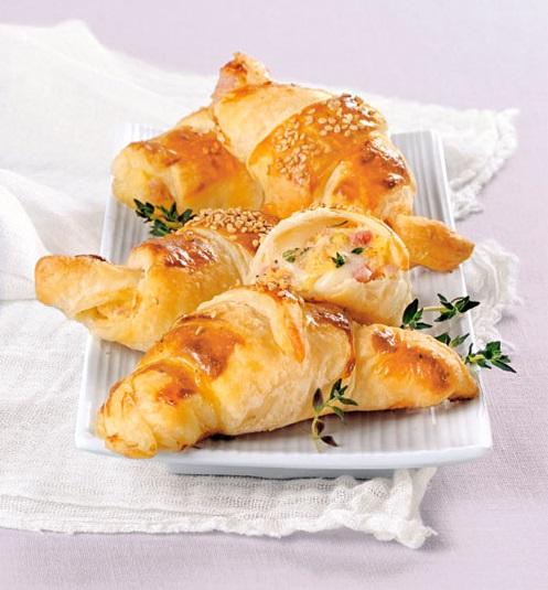 2. Тесто раскатать в круглый пласт и нарезать его секторами (10–12 шт.). На широкую сторону треугольников выложить немного начинки и свернуть их трубочками. Смазать желтком, посыпать кунжутом и выпекать 15–20 мин (200°).