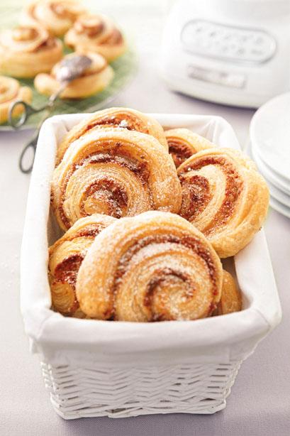 2. Получившуюся начинку распределить по тесту и свернуть рулетом. Нарезать крупными кружками толщиной около 1,5 см. Выложить на противень, выстланный бумагой для выпекания, и поместить в духовку на 20 мин (200°). Перед подачей посыпать сахарной пудрой.