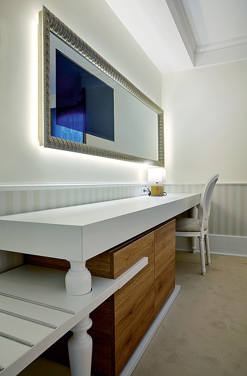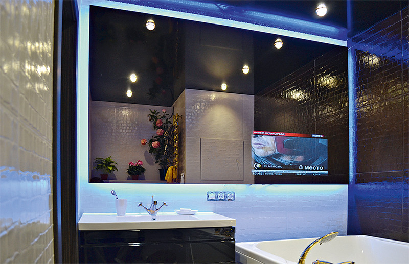 Одним из популярных дизайнерских решений является установка встраиваемых телевизоров в зеркала. В выключенном состоянии такое зеркало ничем не отличается от обычного, а при включении часть его преображается в телевизионный экран.
