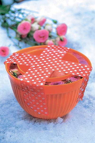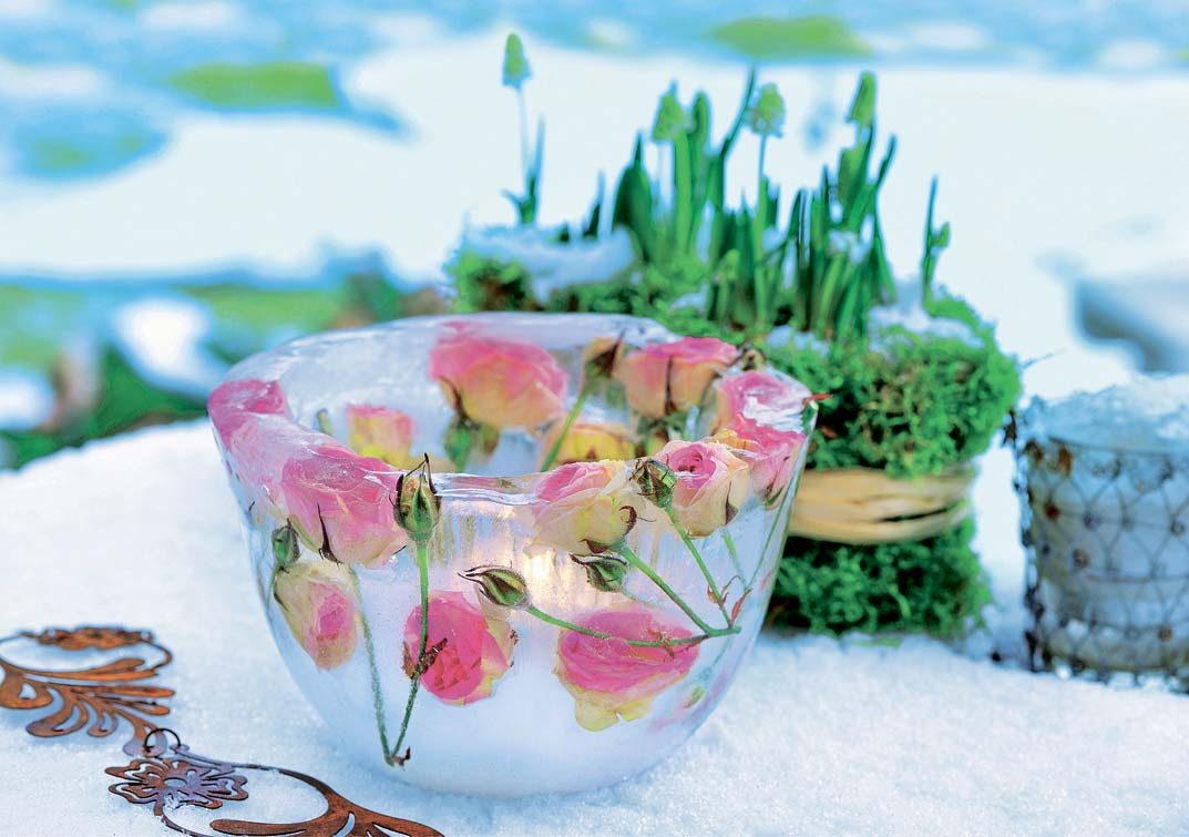 Это изысканное украшение из цветов можно сделать своими руками. Нужно залить воду в пластиковую емкость – до половины, и заморозить ее. Затем положить на лед цветы, залить водой доверху – и снова в морозилку. Чтобы легко вынуть лед, полей перевернутую емкость снаружи горячей водой.