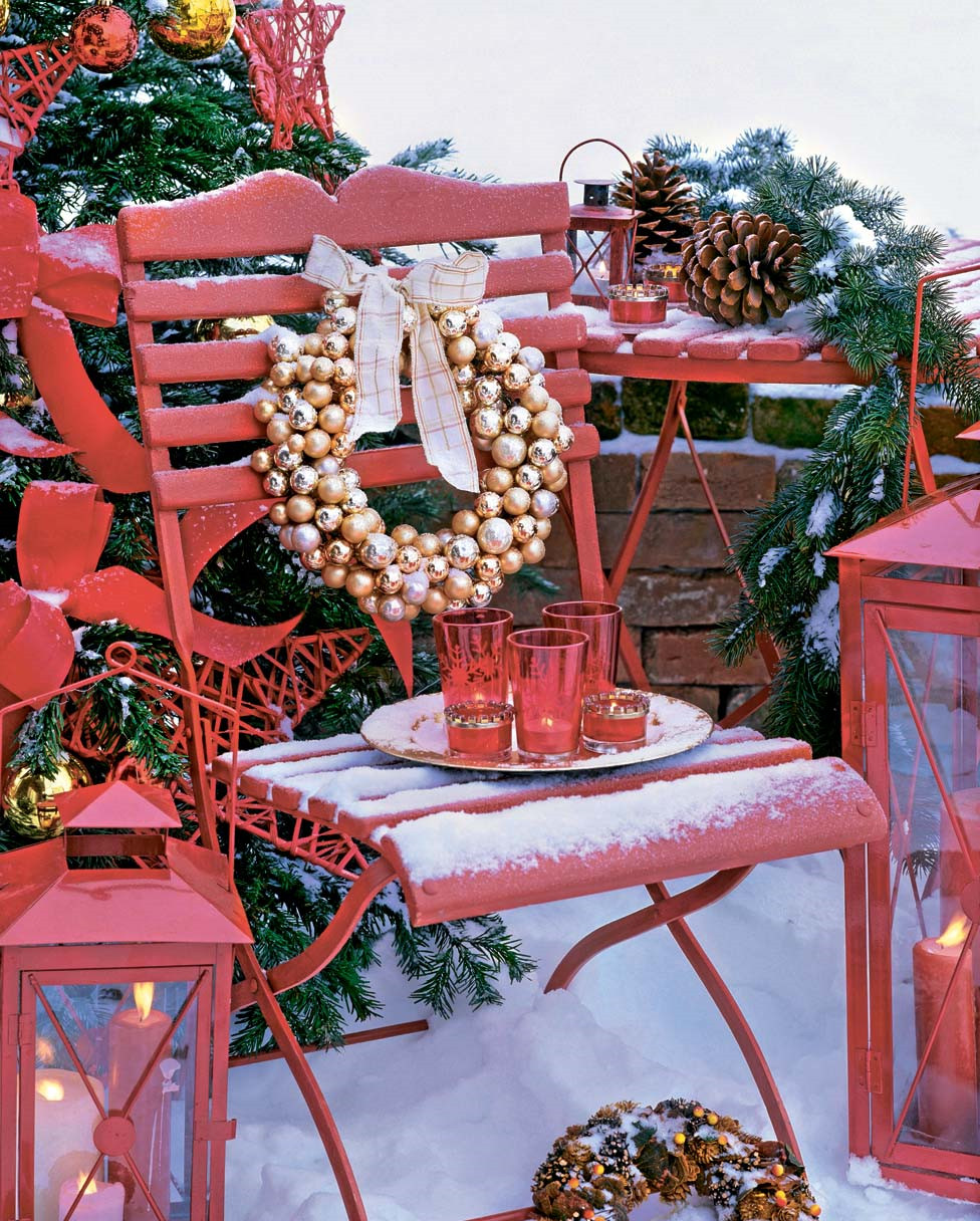 В мороз ты вряд ли будешь сидеть на балконе. Поэтому можешь смело использовать пластиковую или деревянную уличную мебель для создания праздничной атмосферы. Классическое сочетание новогодних оттенков, красного и золотого, плюс шишки, фонарики и свечи в стаканах (для защиты от ветра), а зима довершит дело, присыпав все легким снежком.