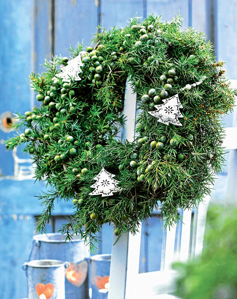 Венок из можжевеловых веток, украшенный белой мишурой, выглядит очень элегантно. Эффектный штрих – зимние ягоды. Можно прикрепить их проволокой.