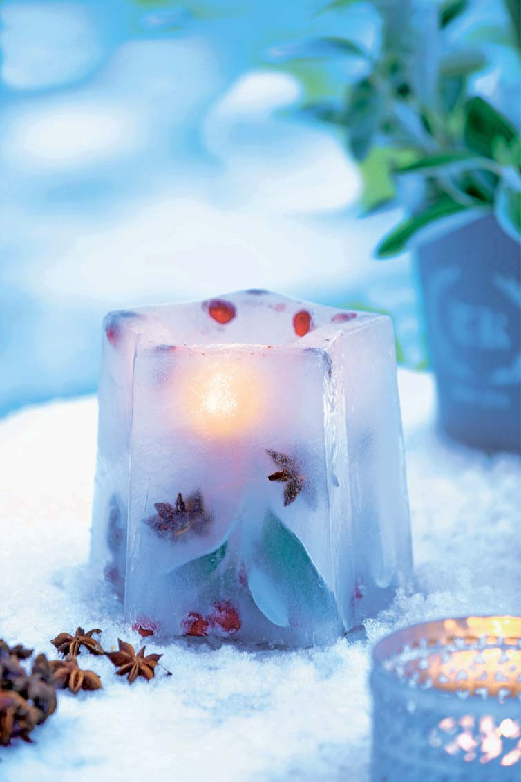 Для создания ледяного декора используй яркие цветы. В качестве формы хорошо служат как пластиковые миски, так и бутылки – в них можно расположить цветок вертикально, отрезав дно.