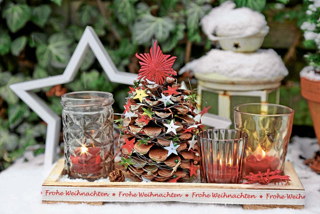 Постарайся минимизировать расход сил, времени и средств – используй по максимуму то, что уже есть. Конечно, идеально, если на участке растет живая ель, которую можно украсить. Но если ее нет, не нужно идти в лес и рубить деревце. Можно использовать любое хвойное растение – тую, пихту. Или колючий кустарник, замаскировав его под ель. Для этого сделай гирлянду из еловых или сосновых шишек, нанизав их на проволоку, и закрепи ее на кусте. Добавить «пушистости» можно, прикрепив в разных местах кустарника живые еловые ветки. После чего украшай растение на свой вкус мишурой и елочными игрушками. Развесь по участку светильники-гирлянды, оберни ими стволы и ветви деревьев. Только покупай лишь те гирлянды, которые предназначены для наружного использования. Лучше всего смотрятся влагозащищенные гирлянды «клип лайт», светящиеся нити, бахрома.