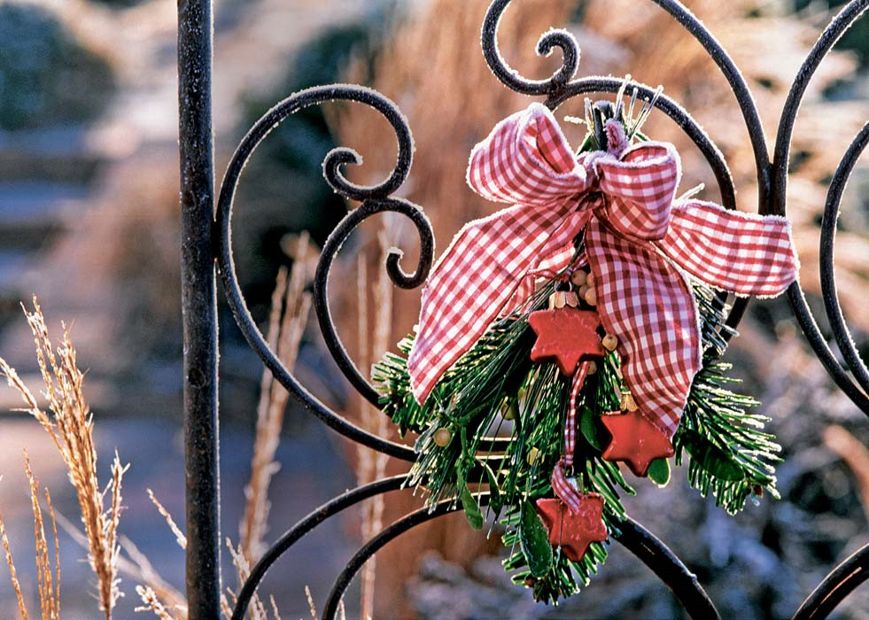 Балконная решетка может стать основой для простого, но очень симпатичного декора: еловая веточка, яркая мишура и бант из ленты в красную клетку. Сделай несколько таких украшений и развесь по всему периметру балкона.