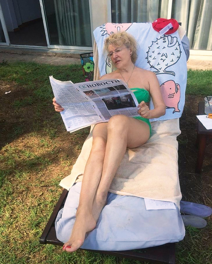 «Это провокационное фото сделано на Кипре без моего согласия – муж взял и «щелкнул». Хоть бы предупредил, я бы макияж сделала! Но вроде неплохо получилось», – так Светлана Сергеевна рассказывает в интервью о нашумевшем снимке из ее Instagram (соцсеть признана в РФ экстремистской и запрещена), на котором она запечатлена в шезлонге с голыми ногами.