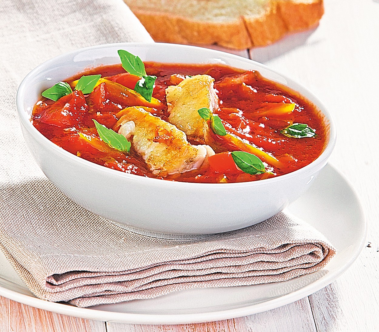 - Маринад нагреть в кастрюле и подрумянить на нем лук. Добавить сладкий перец и жарить еще 5 мин. Положить помидоры и рыбу, влить томатный сок и бульон. Посолить и варить 10 мин.