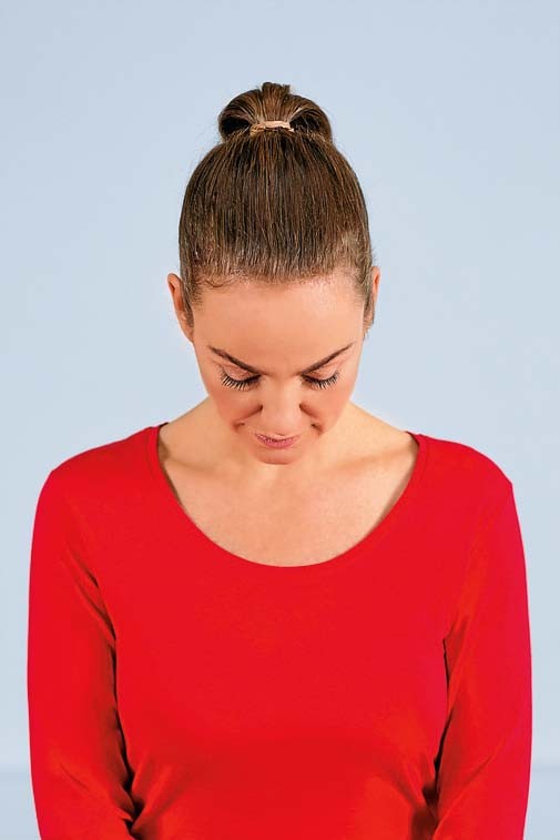 2. Затем опусти голову вниз так, чтобы твой подбородок коснулся груди. Внимание: при выполнении упражнения не поднимай плечи!