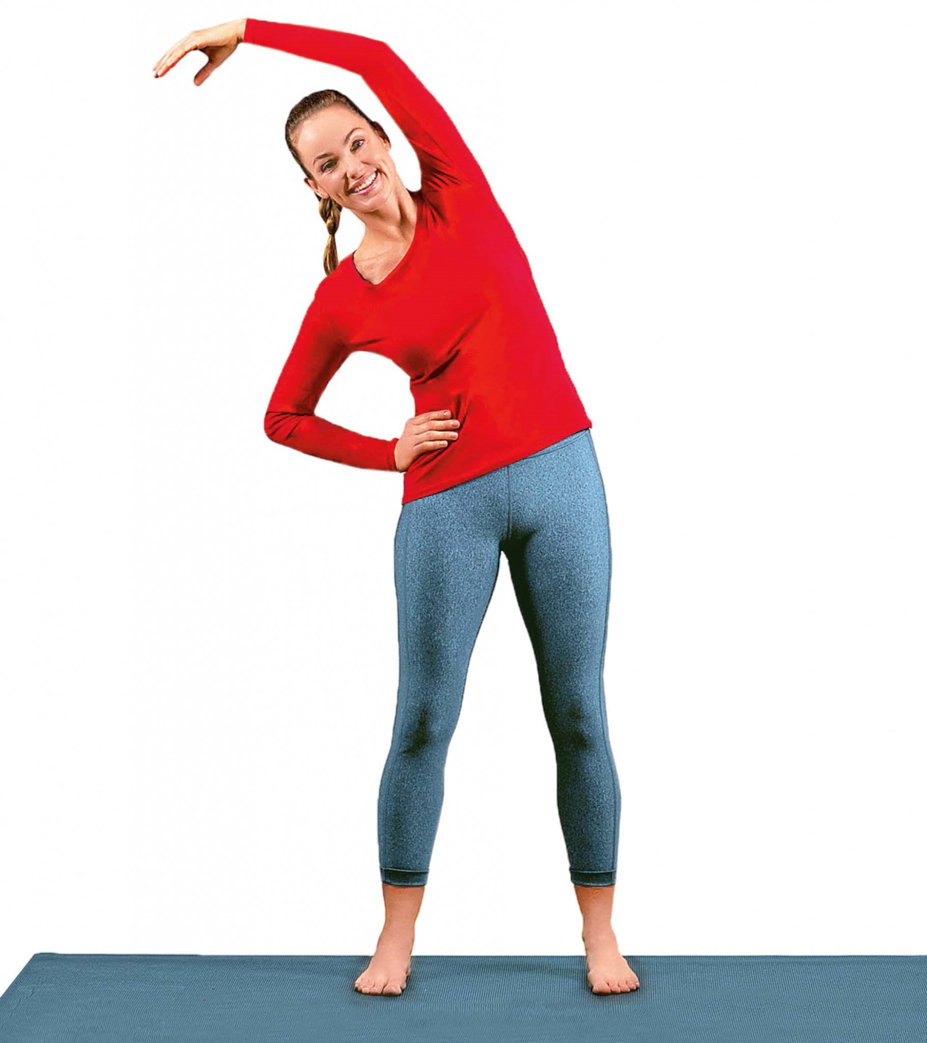 1. Исходное положение – стоя, спина прямая, ноги на ширине плеч, руки на поясе. Подними одну руку вверх над головой, медленно наклоняйся вслед за ней.