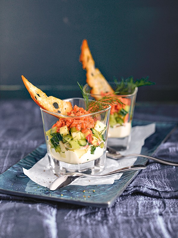 Приготовление: масло взбить с лимонным соком. Залить мелко нарезанную рыбу и убрать в холод на 1 ч. Лук-порей нарезать, перемешать с хреном, сливками и творожным сыром. Разложить по бокалам. Сверху выложить огурец и яблоко, нарезанные кубиками, и лосось.