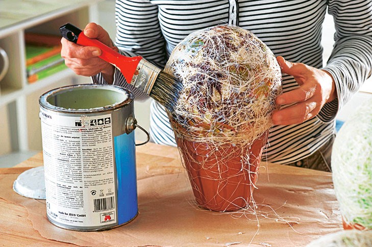 1 ШАГ: Надуй шар. Положи на цветочный горшок. На выступающую часть аккуратно приклей кусочки бумаги скотчем. А далее по кругу кистью приклеивай сухие листья и сизаль. И так в несколько слоев.