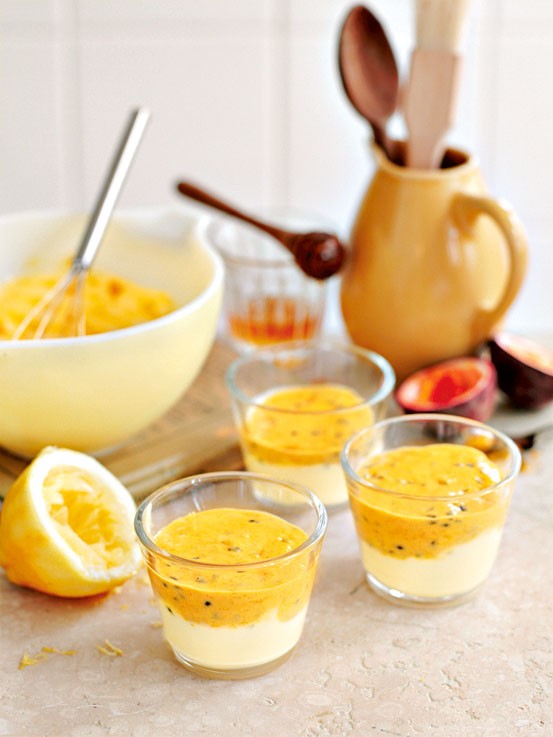 На 4 порции: •5 желтков •90 г сахара •60 мл лимонного сока •140 мл белого полусладкого вина •2 плода маракуйи или 1/2 манго •200 мл сливок (жирность 33%) •1 ст. л. сахарной пудры