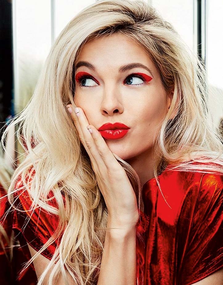 Нарисуй красным карандашом широкие графичные стрелки и им же сделай макияж губ.