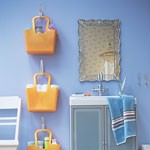 Используй стену как палитру для своей фантазии. Прикрепи к ней резиновые тапочки, имитируя следы наверх. Или устрой каскад из удобных пластиковых корзин для хранения.
