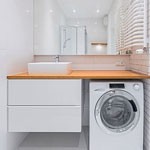 В маленькой ванной комнате должен работать каждый сантиметр. В том числе и место под раковиной, где можно установить полочки, и над стиральной машиной (полка-столик).
