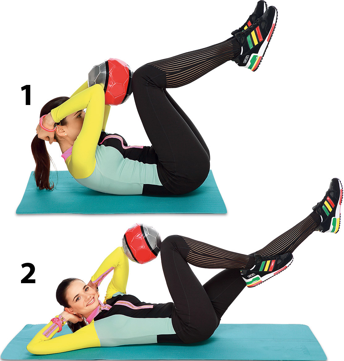1. Ляг на пол, колени подтяни к груди, голову приподними, руки согни. Зажми мяч между коленями и локтями.