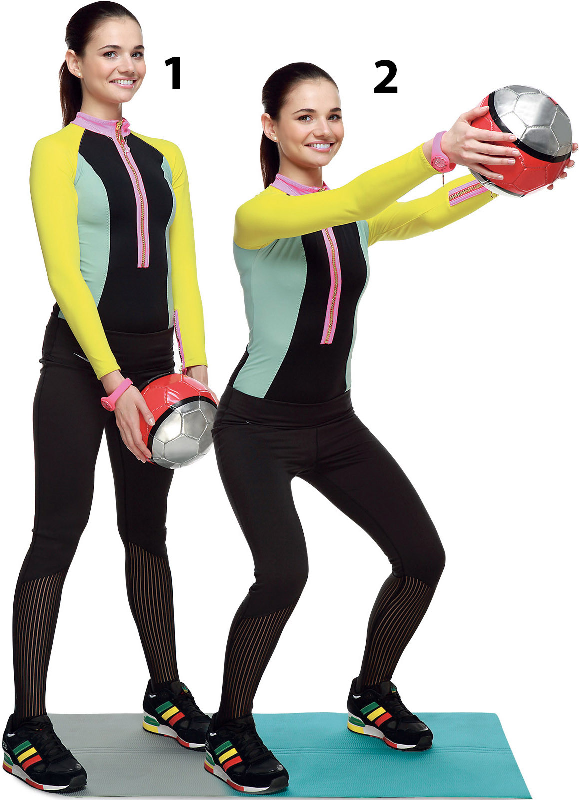 2. На выдохе выполни приседание (так, будто пытаешься сесть на край стула) и одновременно подними мяч на уровень глаз. На вдохе вернись в исходное положение. Повтори упражнение 10 раз. Это упражнение следует выполнять максимально медленно.