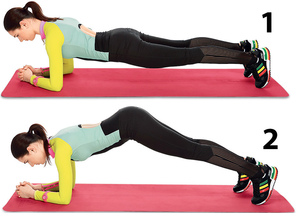 2. Не меняя положения рук и ног, подними ягодицы. Задержись на два счета, вернись в исходную позицию, повтори два раза.