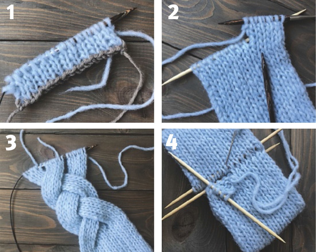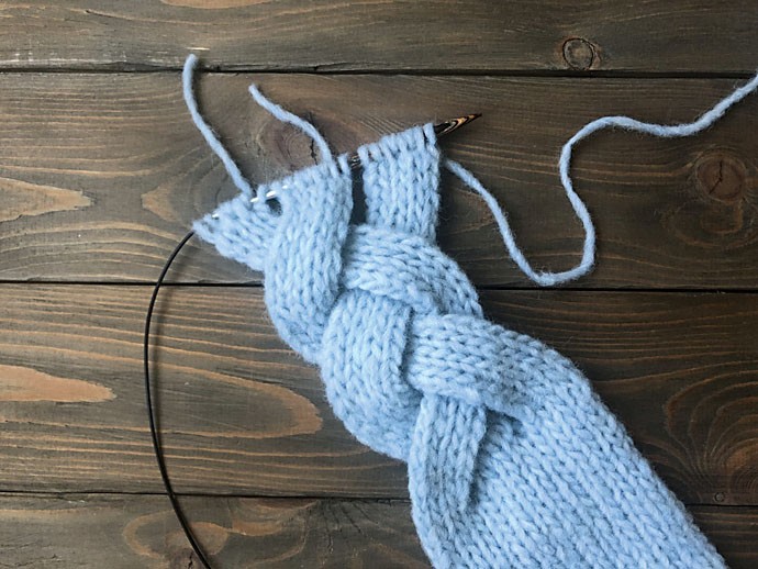 Петли не закрываем, оставляем конец нити длиной 40–45 см, снимаем все открытые лицевые петли с одной стороны на одну чулочную спицу, лицевые с обратной стороны – на другую. Соединяем концы повязки трикотажным швом, чтобы стыков не было видно, концы нити прячем с помощью иголки или крючка.