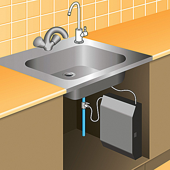 - установка обратного осмоса, которая удаляет нитраты, натрий, другие растворенные соединения, одним словом, всякую «химию». Фильтр избавляет воду от неприятного привкуса, запаха или цвета;