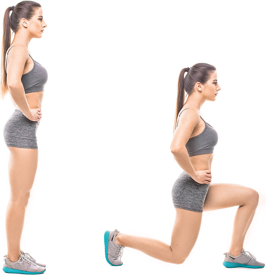 Следи, чтобы колено впередистоящей ноги находилось над пяткой, а стопа была прижата к полу.