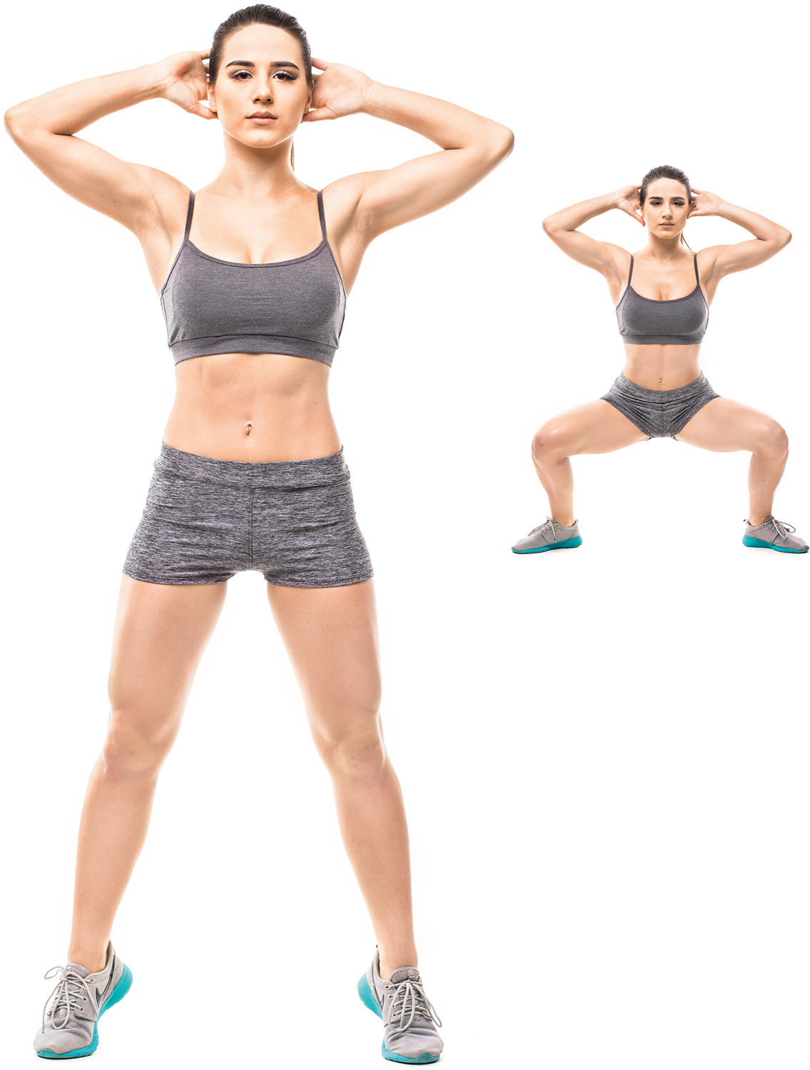 Стоя, ноги на ширине плеч, разверни стопы наружу на 30–45 градусов. Руки заведи за голову. Делая приседания, опускай таз так низко, чтобы колени были на уровне бедер.