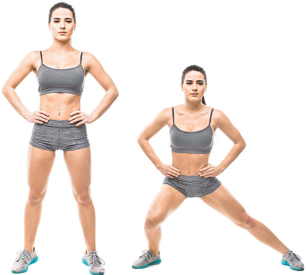 Стоя, ноги на ширине таза. Сделай шаг вправо или влево (стопы прижаты к полу). Удерживая колено над стопой, опусти таз так, чтобы бедра были параллельны полу. Повтори упражнение в другую сторону.