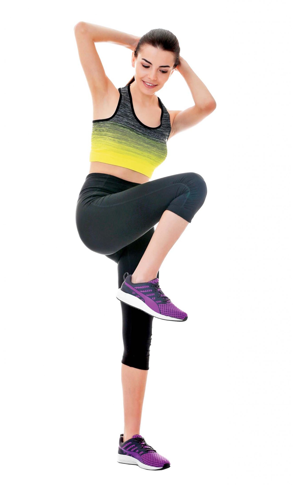 1. Исходное положение: стоя, выпрями спину, живот втяни, руки заведи за голову.