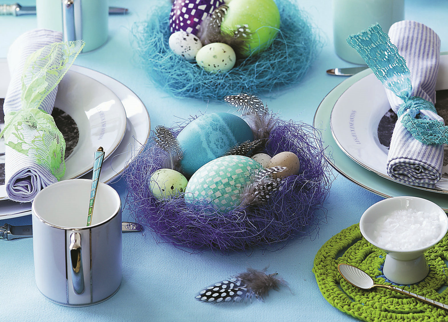 Перед окрашиванием заверни яйцо в марлю или тонкий чулок, а внутрь положи веточку укропа, петрушки или другой зелени. Ткань закрепи и опусти в раствор с краской, после окрашивания сними трафарет – получится рисунок чуть светлее основного цвета.