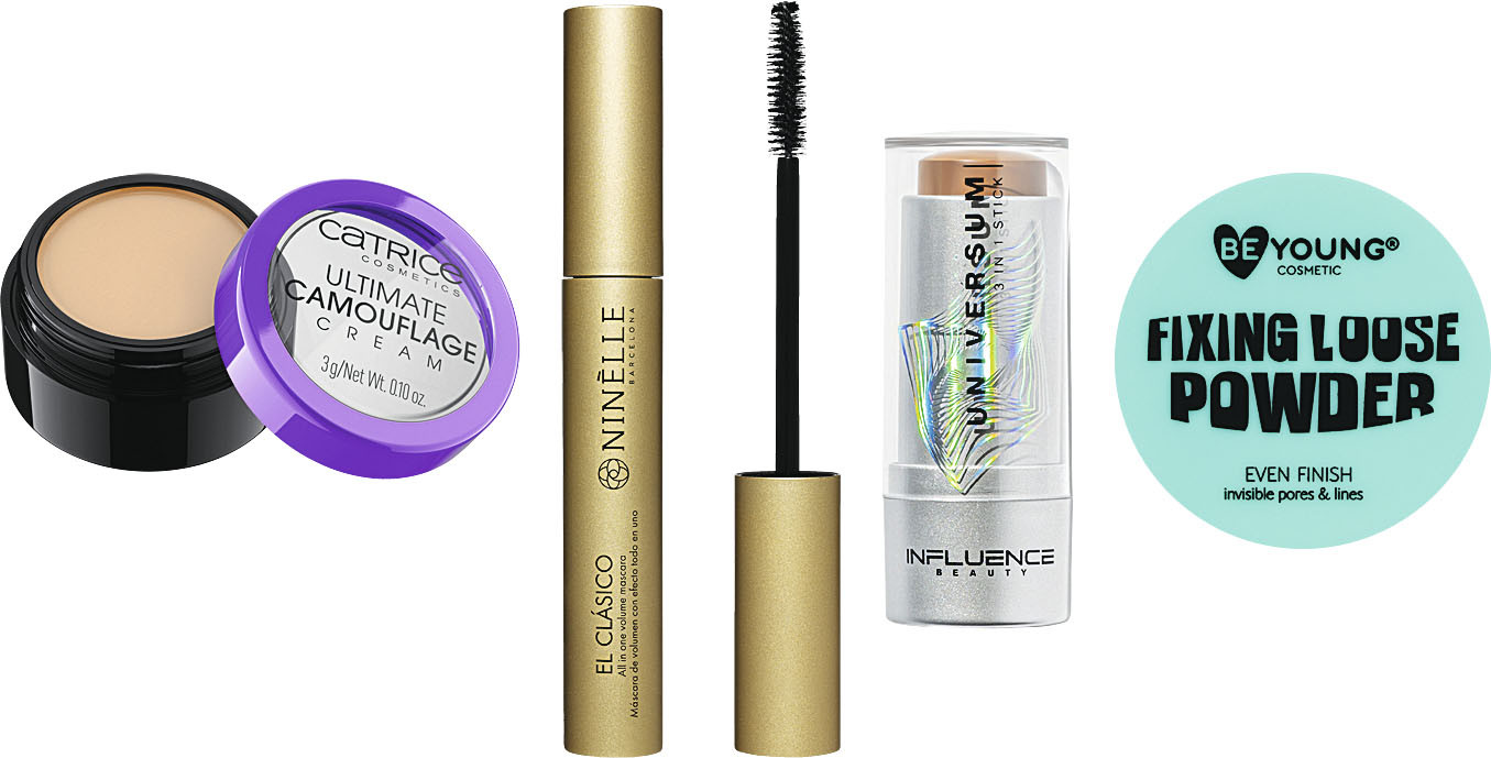 Слева направо. Стойкий консилер Ultimate Camouflage Cream, CATRICE. Универсальная тушь для ресниц El Clasico, NINELLE. Универсальный стик 3-в1 для макияжа глаз, лица и губ Universum, INFLUENCE BEAUTY. Выравнивающая пудра для лица, BEYOUNG