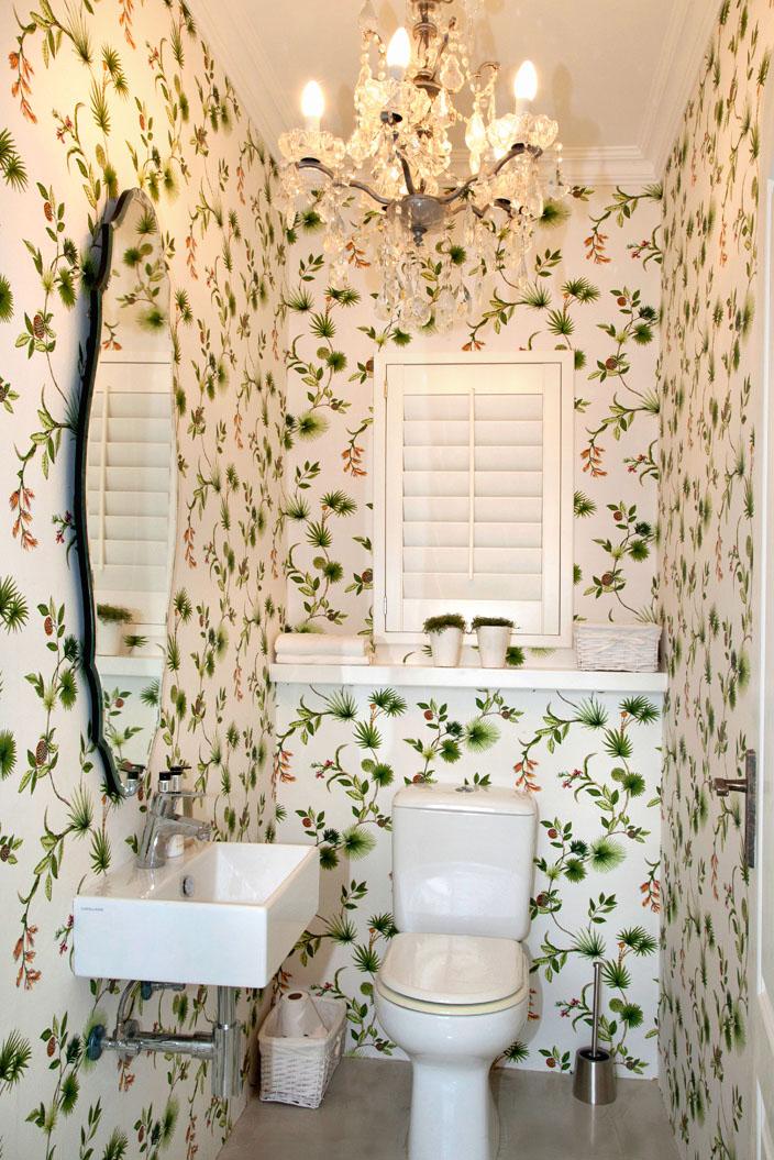 Обои в мелкий цветочек, на потолке неожиданная люстра, вазы, статуэтки – очень нежно и красиво.
